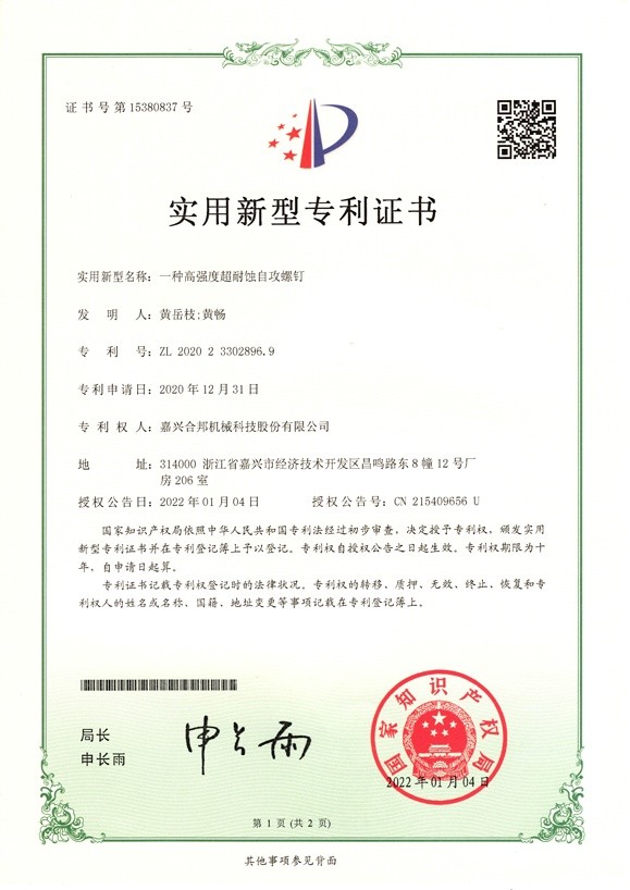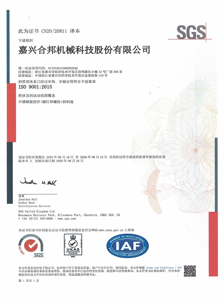 嘉興合邦機械科技股份有限公司具有自主知識產權的不銹鋼熱處理和表面處理工藝和設備,是制造高強度不銹鋼緊固件的實力型企業。公司以不銹鋼混凝土自攻錨栓、鉆尾自攻螺釘、自攻螺釘、高強度不銹鋼螺栓類緊固件為主打產品,產品應用于多種鋼結構建筑、戶外設施設備及地鐵、鐵道、橋隧、公路、電網、汽車、造船、機械裝備等行業;首都機場T3航站樓、央視大廈、北京南站、上海虹橋高鐵、2022亞運主場館杭州奧體中心、上海迪斯尼、首鋼京唐鋼鐵、寶鋼湛江鋼鐵、特斯拉上海超級工廠等等標志性建筑上都有合邦科技的產品在默默堅護。