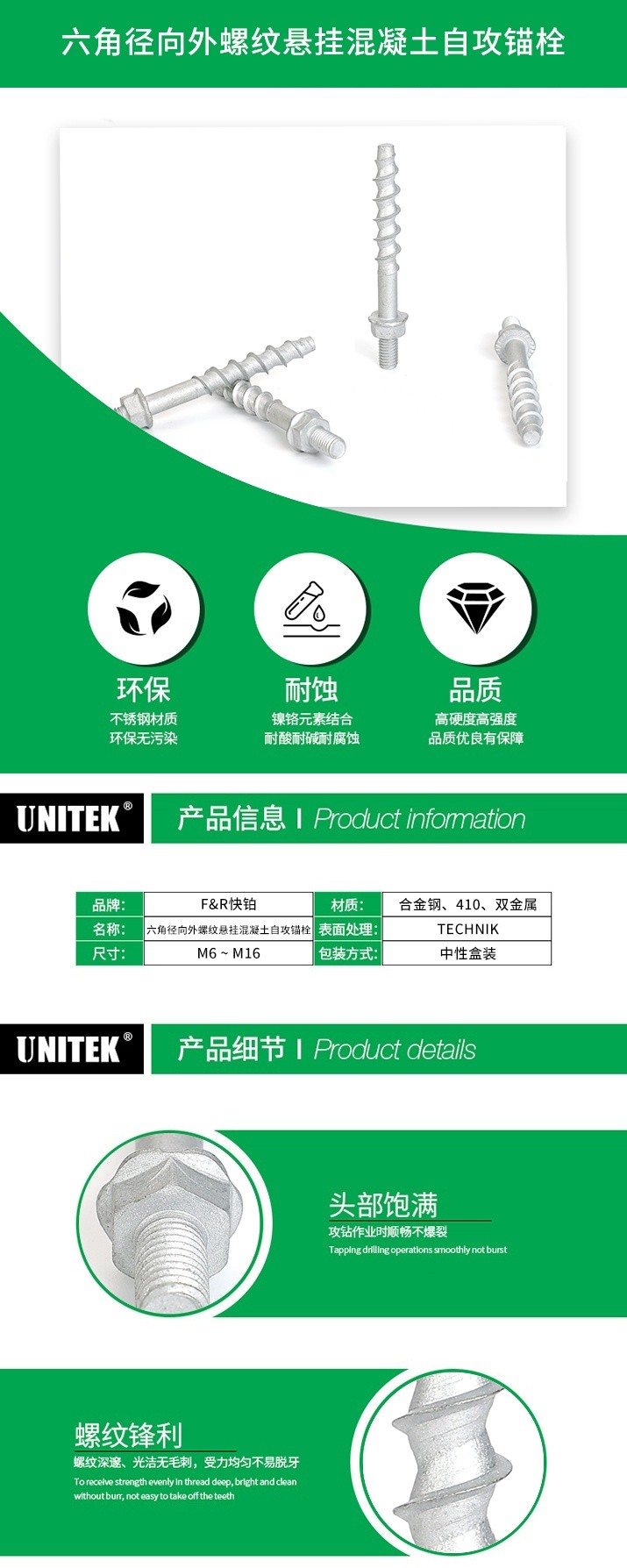六角徑向外螺紋懸掛混凝土自攻錨栓